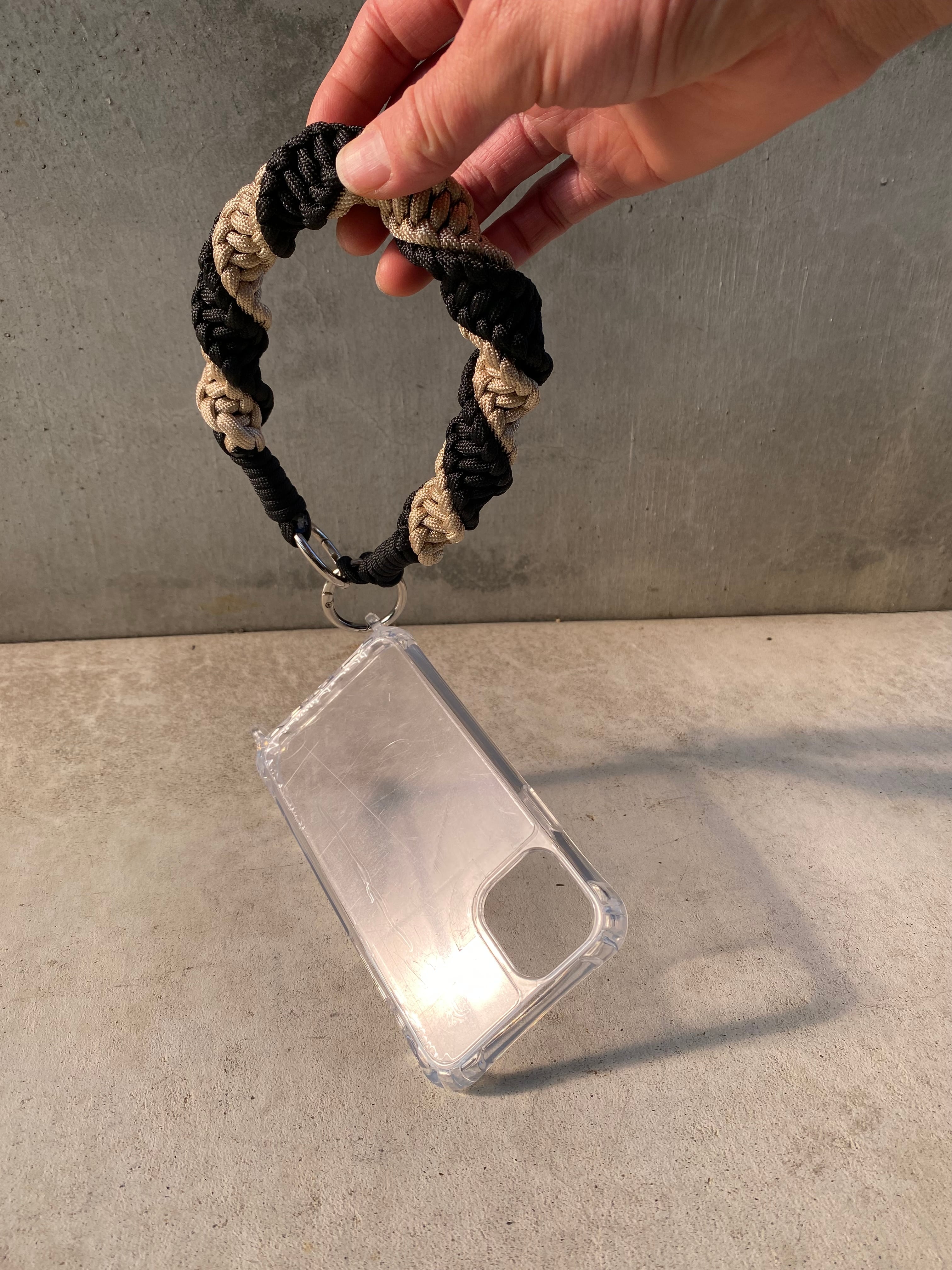 発送まで1週間ほど時間をいただきます 3wayストラップ 5 ブラック×キラブラック×チャコール✖️細ネイビー 3通りの使い方ができる便利なストラップセットです。 ・長いストラップ(約100cm・カラビナ付き) ・短いストラップ(約35cm・カラビナ付き) 2本を自由に組み合わせて、シーンに合わせた使い方が可能です。 【使い方例】 1way:スマホショルダーストラップ 長いストラップと短いストラップを連結すると、スマホを斜め掛けできるショルダータイプになります。 2way:バッグストラップ・ハンディ扇風機用ストラップ 長いストラップ1本だけで、バッグやハンディ扇風機用のストラップとして使用できます。 3way:ハンドストラップ 短いストラップ1本だけで、手首にかけて使えるハンドストラップとして活躍します。 ・素材: パラコード 使いやすさだけではなく、おしゃれさも兼ね備えたアイテムです。 コーディネートのアクセントとして楽しむ中で、スマホをしっかりと守る機能性を備えています。 あなたのスマホライフをより便利でスタイリッシュに演出するハンドメイドの一品です。 • 本商品はハンドメイドのため、製作過程における多少の個体差があります。1㎝ほどの誤差が出てしまう場合がありますので予めご了承ください。 • 取り扱いには十分ご注意ください。強い力を加えるとパラコードが破損する恐れがあります。 • 使用中のトラブルや損傷については、責任を負いかねますので、自己責任での使用をお願いいたします。商品発送後にほつれ破損があった場合は無料でお直しいたします(送料はお客様ご負担でお願いいたします)。 • 色味や素材感は画面環境により実物と異なる場合がございます。気になる点があれば購入前にご質問ください。 焼き上げ処理について: 端部や繋ぎ目部には、焼き上げ処理を施し、ほつれ防止としてしっかりと固定しておりますが、強い衝撃や摩擦が加わると、焼き上げ部分が損傷する可能性がありますのでご注意ください。処理の仕上がりには多少の差異があることをご了承ください。 焼き上げ処理は手作業による自然な仕上がりであり、品質に問題はありません。