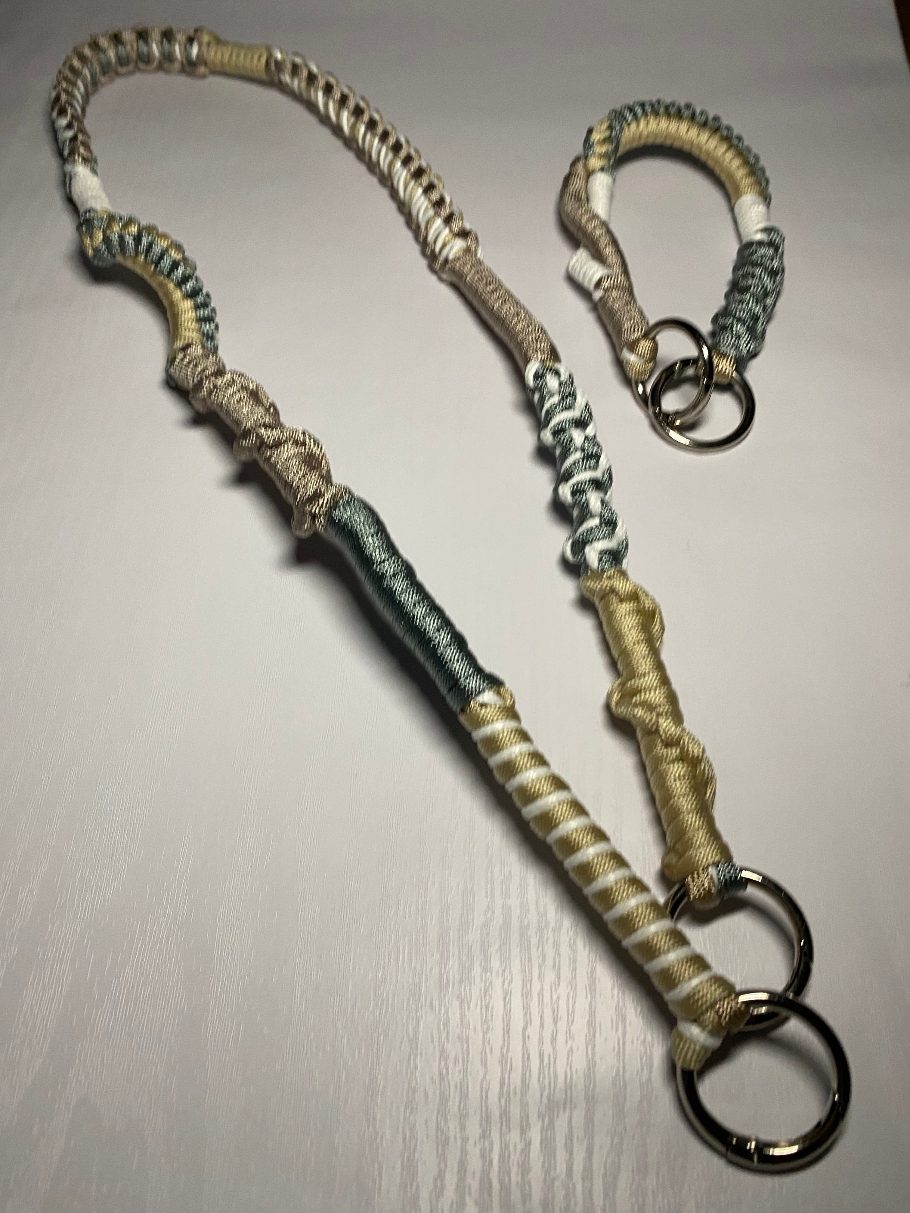 発送まで1週間ほど時間をいただきます 3wayストラップ 4 ゴールド×チャコール×モカ×細アイボリー 3通りの使い方ができる便利なストラップセットです。 ・長いストラップ(約100cm・カラビナ付き) ・短いストラップ(約35cm・カラビナ付き) 2本を自由に組み合わせて、シーンに合わせた使い方が可能です。 【使い方例】 1way:スマホショルダーストラップ 長いストラップと短いストラップを連結すると、スマホを斜め掛けできるショルダータイプになります。 2way:バッグストラップ・ハンディ扇風機用ストラップ 長いストラップ1本だけで、バッグやハンディ扇風機用のストラップとして使用できます。 3way:ハンドストラップ 短いストラップ1本だけで、手首にかけて使えるハンドストラップとして活躍します。 ・素材: パラコード 使いやすさだけではなく、おしゃれさも兼ね備えたアイテムです。 コーディネートのアクセントとして楽しむ中で、スマホをしっかりと守る機能性を備えています。 あなたのスマホライフをより便利でスタイリッシュに演出するハンドメイドの一品です。 【ご購入前に必ずご確認ください/キャンセル・お直しについて】 商品到着後のキャンセル・お客様都合によるお直しはお受けしておりません。 サイズ・カラー・使用イメージなど、気になる点がある場合は必ずご購入前にご相談ください。 ・ただし、当方の不具合(発送後1週間以内のほつれ・明らかな初期不良)につきましては対応いたします。 お手数ですが、商品到着後1週間以内にご連絡ください。 ・お客様のご使用状況による破損・劣化・事故等につきましては、対応いたしかねます。 あらかじめご了承のうえ、ご使用をお願いいたします。 【ハンドメイド品について】 ・本商品はハンドメイドのため、製作過程において多少の個体差が生じる場合があります。 サイズは約1cm前後の誤差が出る場合がございますので、あらかじめご了承ください。 ・強い力や過度な負荷を加えると、パラコードが破損する恐れがあります。 ご使用の際は十分ご注意ください。 【焼き上げ処理について】 端部や繋ぎ目部分には、ほつれ防止のため焼き上げ処理を施し、しっかりと固定しております。 ただし、強い衝撃や摩擦が加わると、焼き上げ部分が損傷する可能性があります。 焼き上げ処理はすべて手作業による自然な仕上がりのため、仕上がりに多少の個体差がございますが、品質には問題ありません。